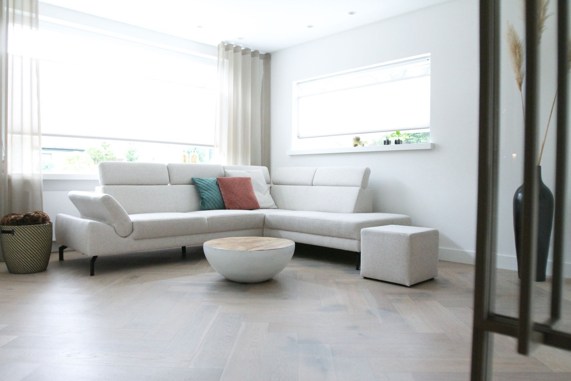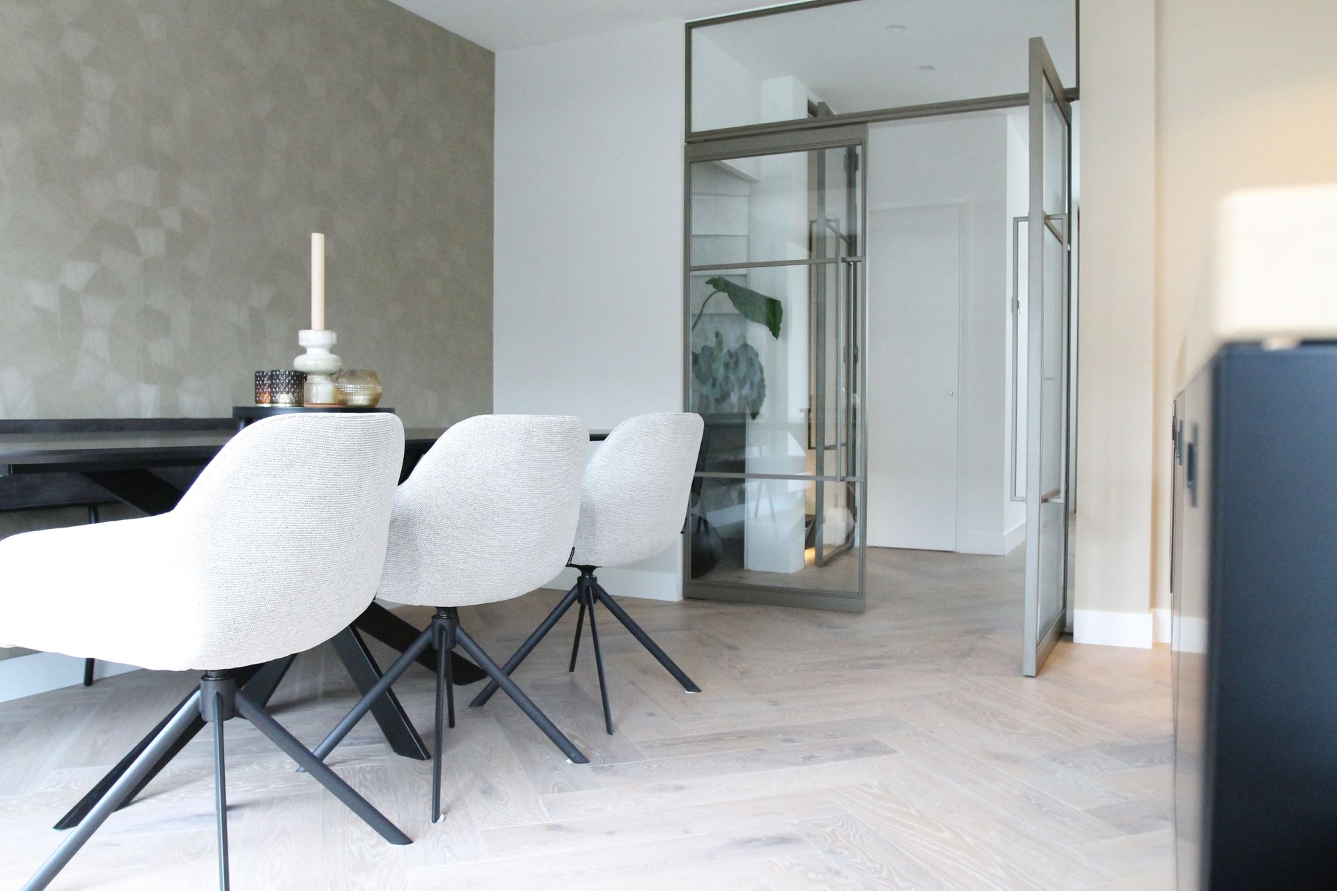 De bestaande houten vloer is opgeschuurd en behandeld met een blanke lak. Verder een behang achter de eetbank. De stoffen van de de bank, eetkamerstoelen en eetbank sluiten naadloos aan bij de verftinten.