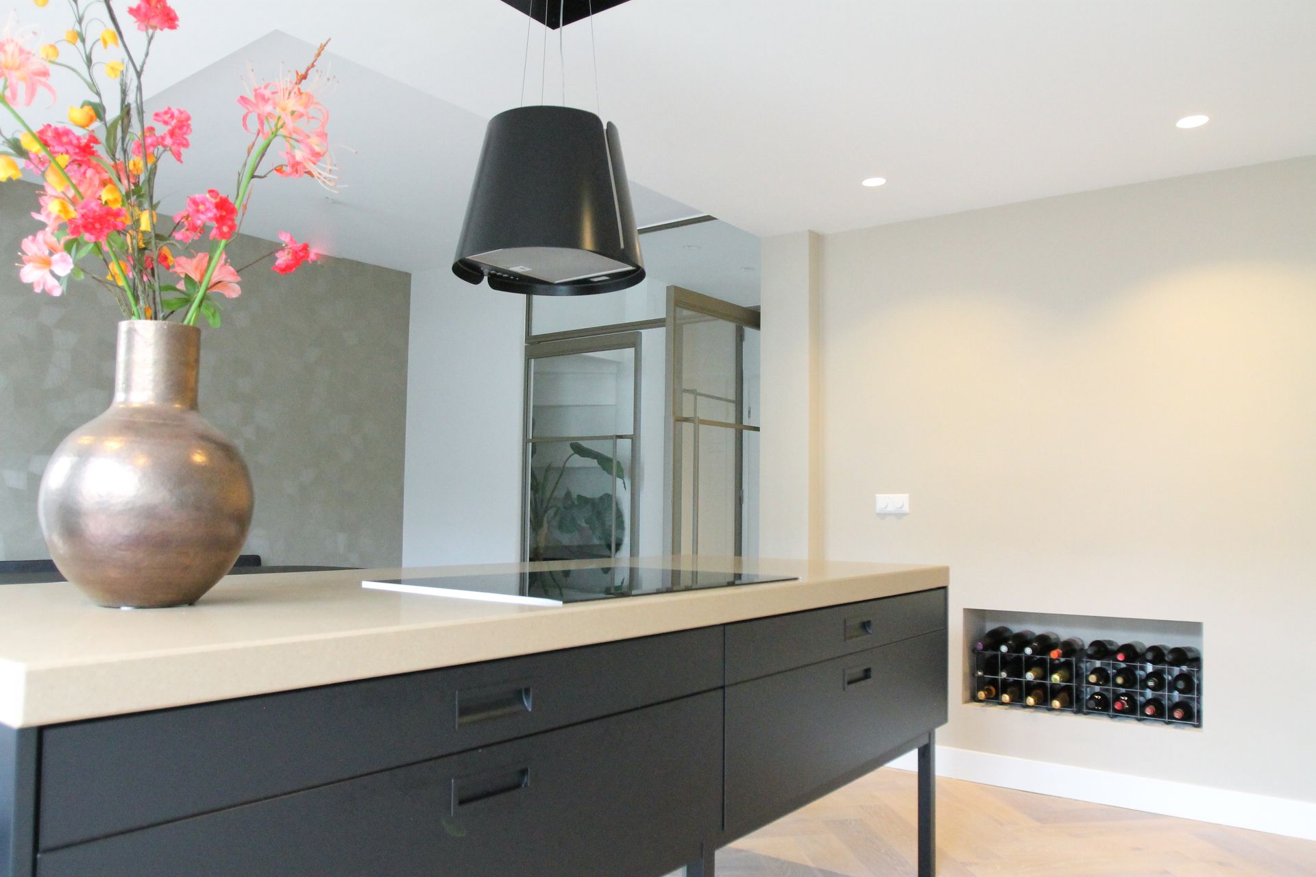 De bestaande keuken heeft een update gekregen van een gelige zandkleur naar wit en het eiland in zwart. Een zeer geslaagde keuken metamorfose.