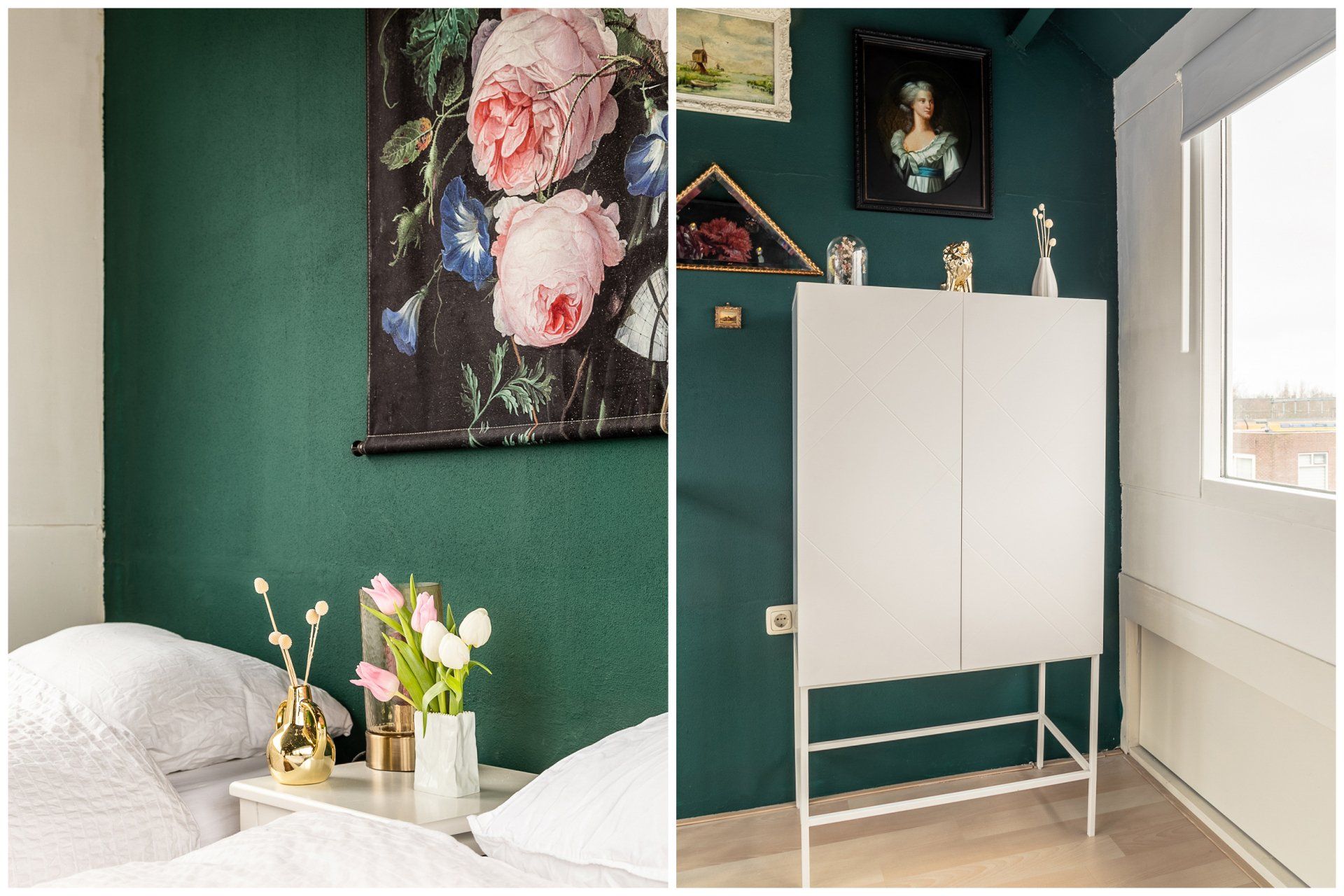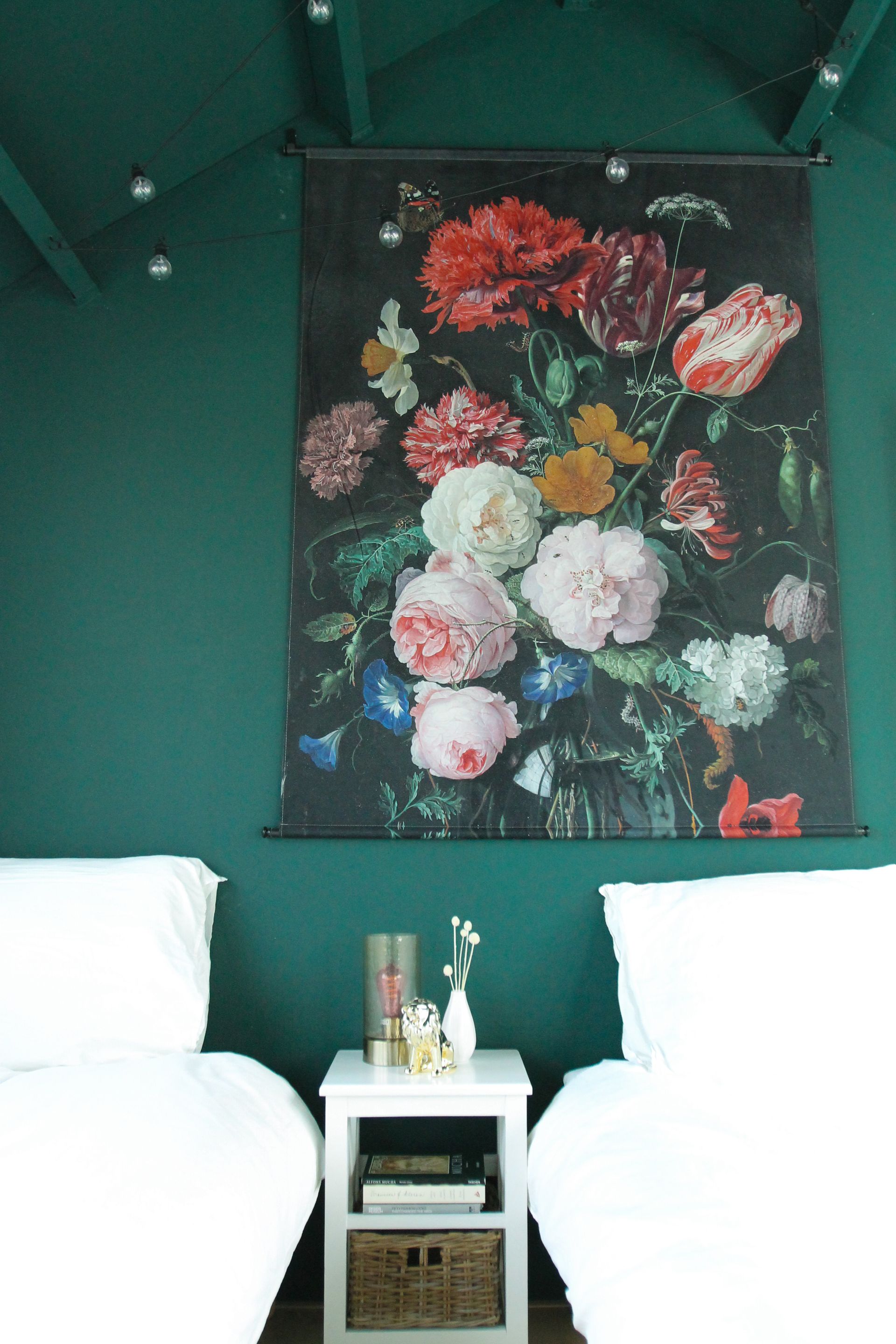 Op de zolderkamer ben ik even los gegaan in kleur. Het werkt hier zo goed, omdat de kamer heel licht is en aan beide kanten ramen heeft. Alle muren en het plafond zijn in een prachtige donker groen Quiet Clearing van Histor geverfd.