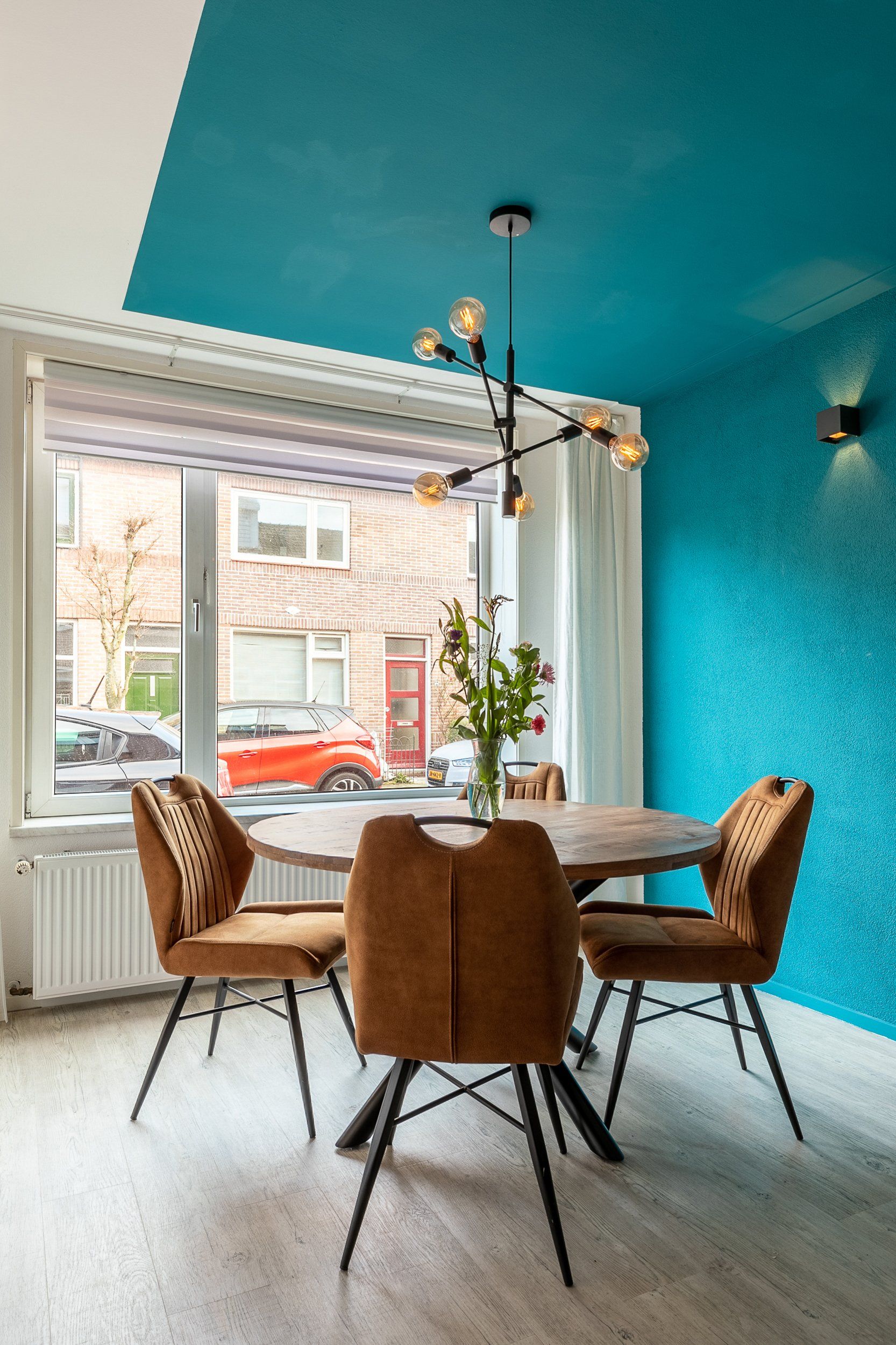 Om een geborgen gevoel te krijgen als je aan de eettafel zit en ook een duidelijke scheiding tussen eten en relaxen, heb ik het vlak op de muur door laten schilderen op het plafond. Kleur is een prachtige teal kleur van Farrow & Ball Vardo 288. Ook door de wandkast te draaien, creëer je een room divider.