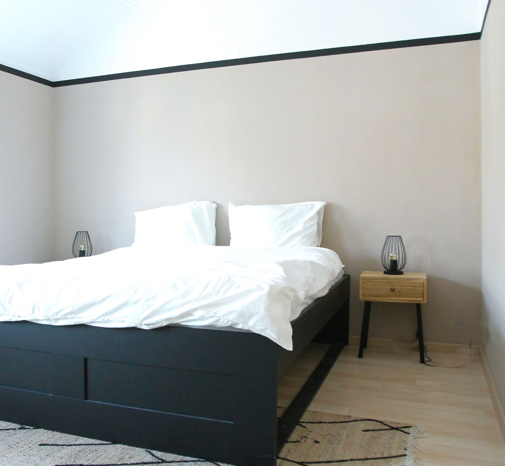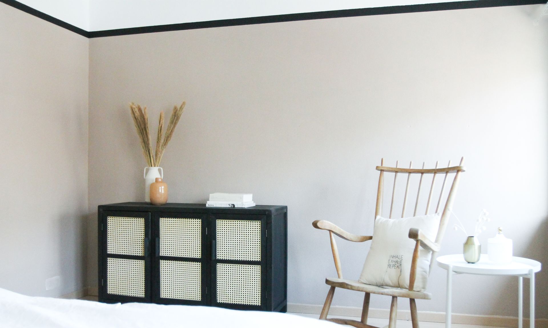 De master slaapkamer straalt rust uit met een pallet in Sand beige/zwart en wit, afgewisseld met natuurlijke materialen, waarbij de wand niet tot het plafond is geschilderd, maar 3/4 met een zwarte rand als speciaal accent.