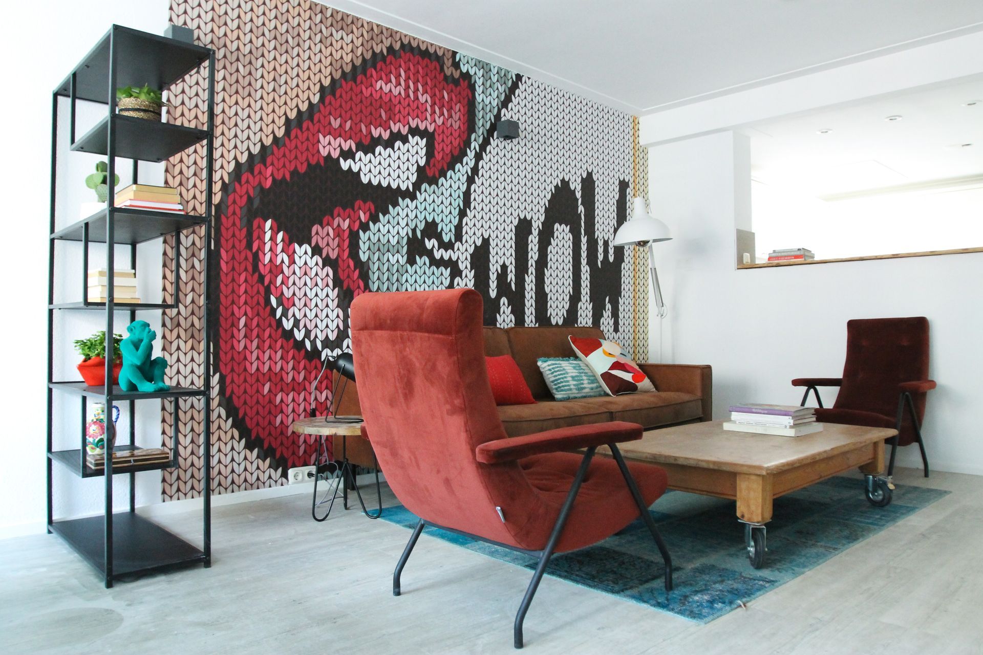 De muur achter de bank heeft een fantastisch Popart behang van Etsy gekregen, welke echt een Wauw factor heeft.