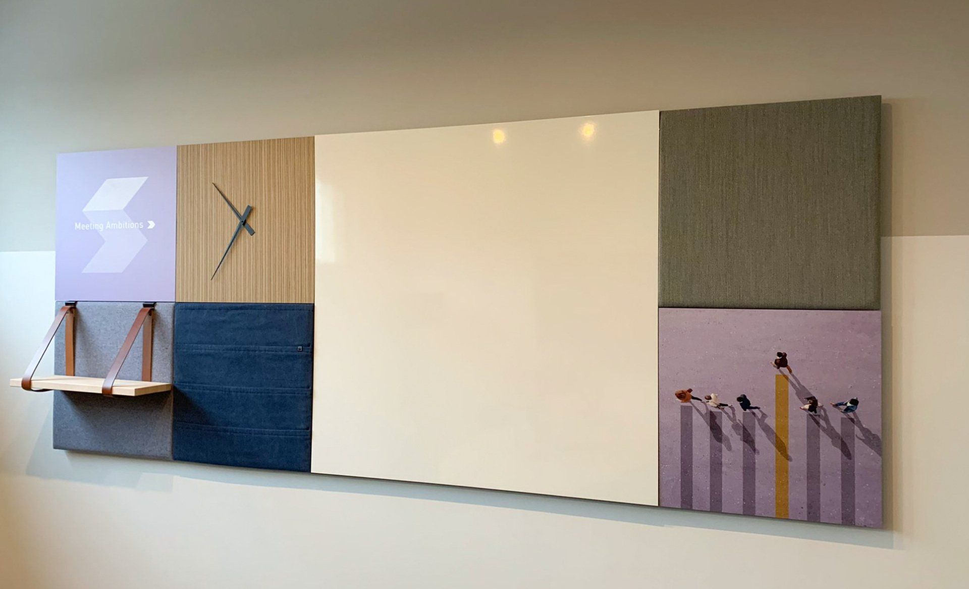 In deze vergaderruimte was een ook een mos wand net als in de entree. Dit was te veel en paste niet bij het bedrijf. Daarom heb ik een ontwerp gemaakt voor deze kamer bij Dock Four. Een prachtige wanddecoratie, die het gat wat de mos wand achterliet verbloemde. Gepersonaliseerde bedrijfsfoto's, klok, white board, jeansstof met vakjes voor je stiften en decoratie, zo creëer je eigenheid en het is functioneel.