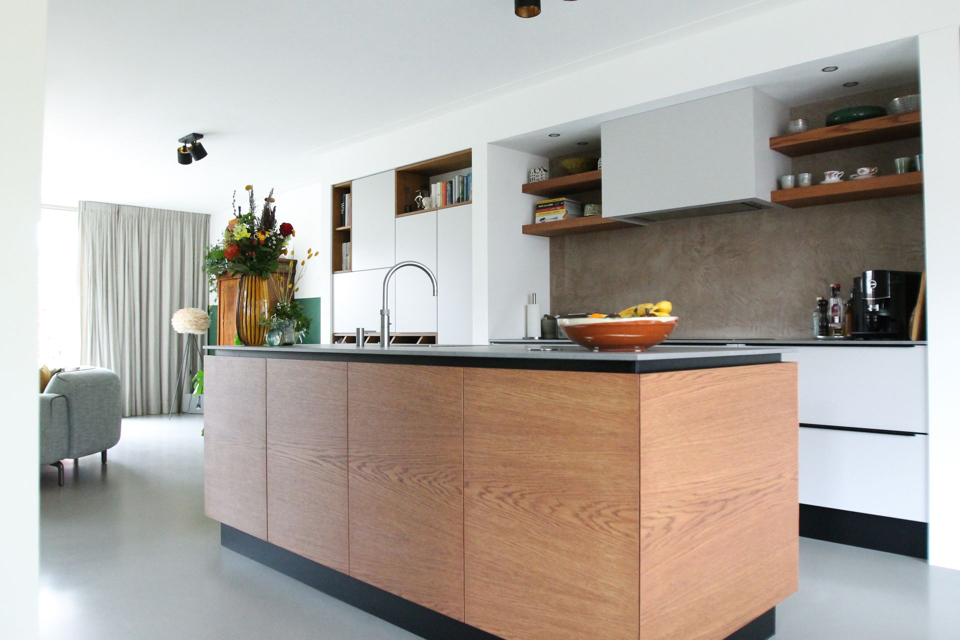 De keuken krijgt nieuw spuitwerk in de kleur Farrow & Ball Purbeck stone 275. Welke mooi aansluit bij de reeds bestaande vloer. Om meer warmte te creëren krijgt het eiland nieuwe fronten in eiken hout en worden er planken toegevoegd naast de schouw. Als achterwand bij de kookplaat komt er beton Cire in een warmere grijs/bruine tint.