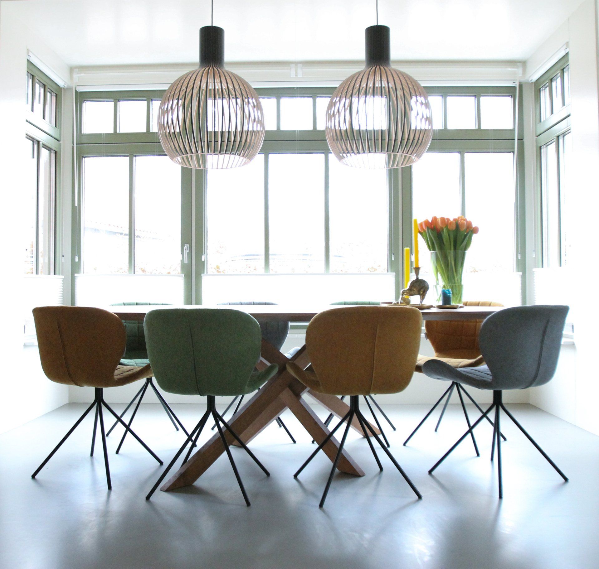 In de erker komt een ovale eettafel in eiken hout, welke dezelfde finish krijgt als het hout in de keuken. Op maat gemaakt en met eiken poten om de warmte te behouden. De stoelen in 3 verschillende kleuren en de Secto Octo lampen maken het plaatje compleet.