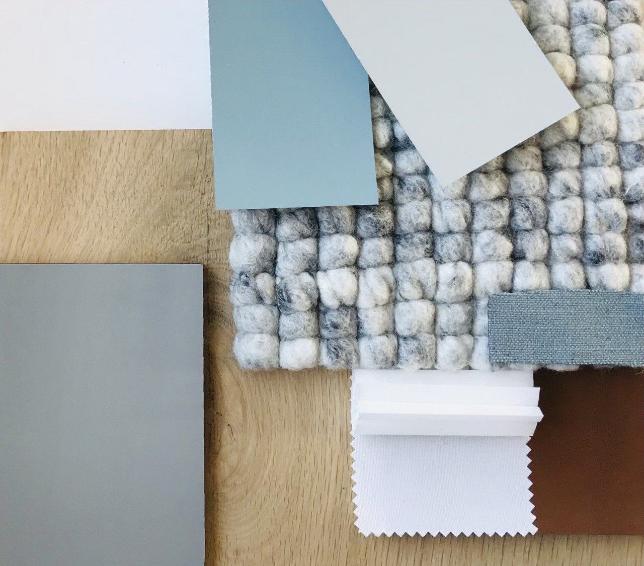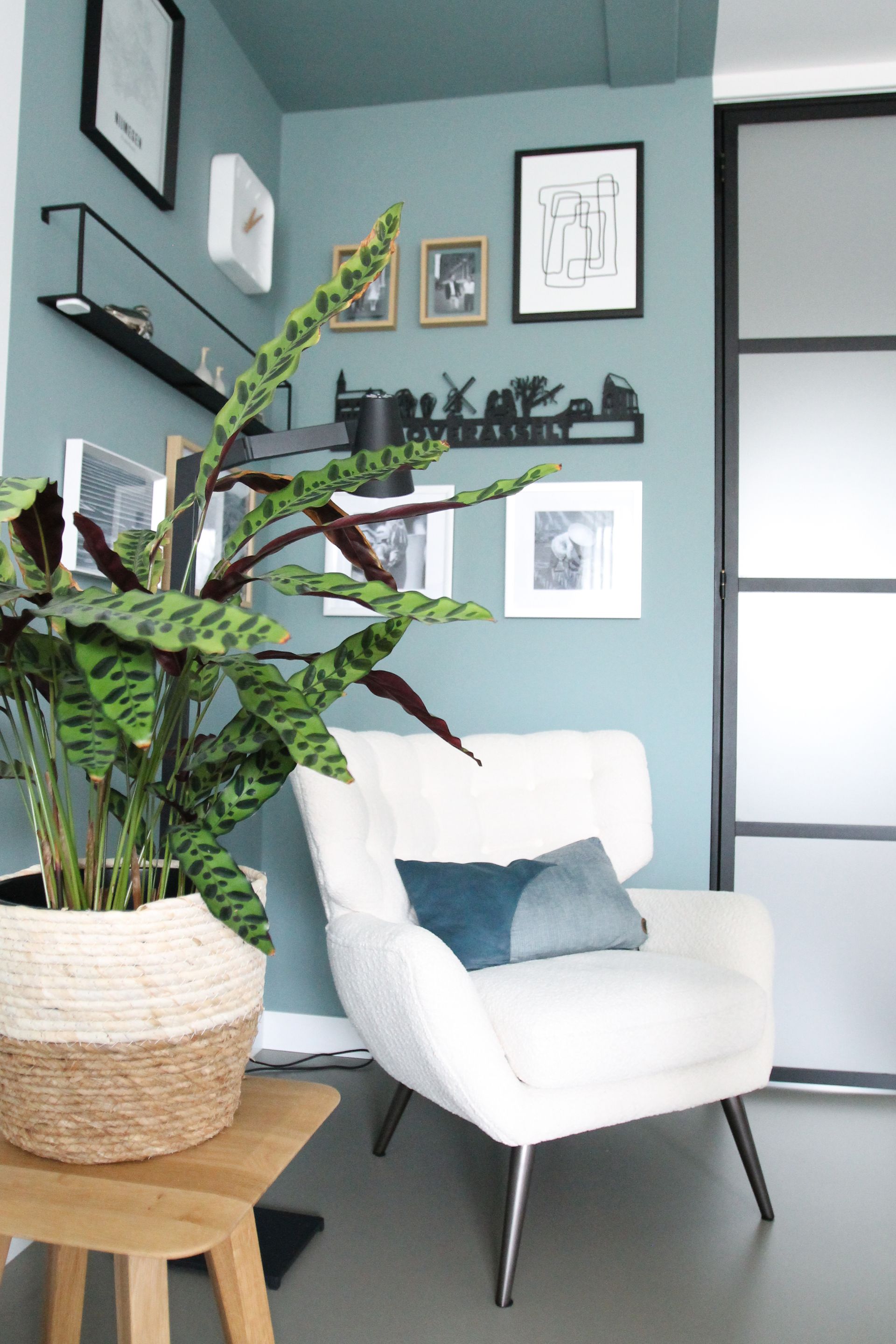 Het leeshoekje met zicht op de tuin krijgt een knus gevoel doordat ook het plafond is mee geschilderd in Farrow & Ball kleur Oval Room Blue.