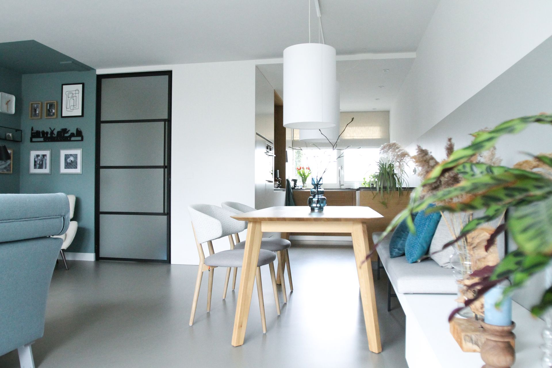 Een vierkante woonkamer is altijd een uitdaging voor de indeling van de verschillende woonfuncties. De bewoners wilden ook nog een flexibele eetplek voor 4 tot 10 personen. Door een lange eetbank te maken, welke ook opbergruimte geeft en een tafel die uitgeschoven kan worden, kan er met veel mensen getafeld worden.
