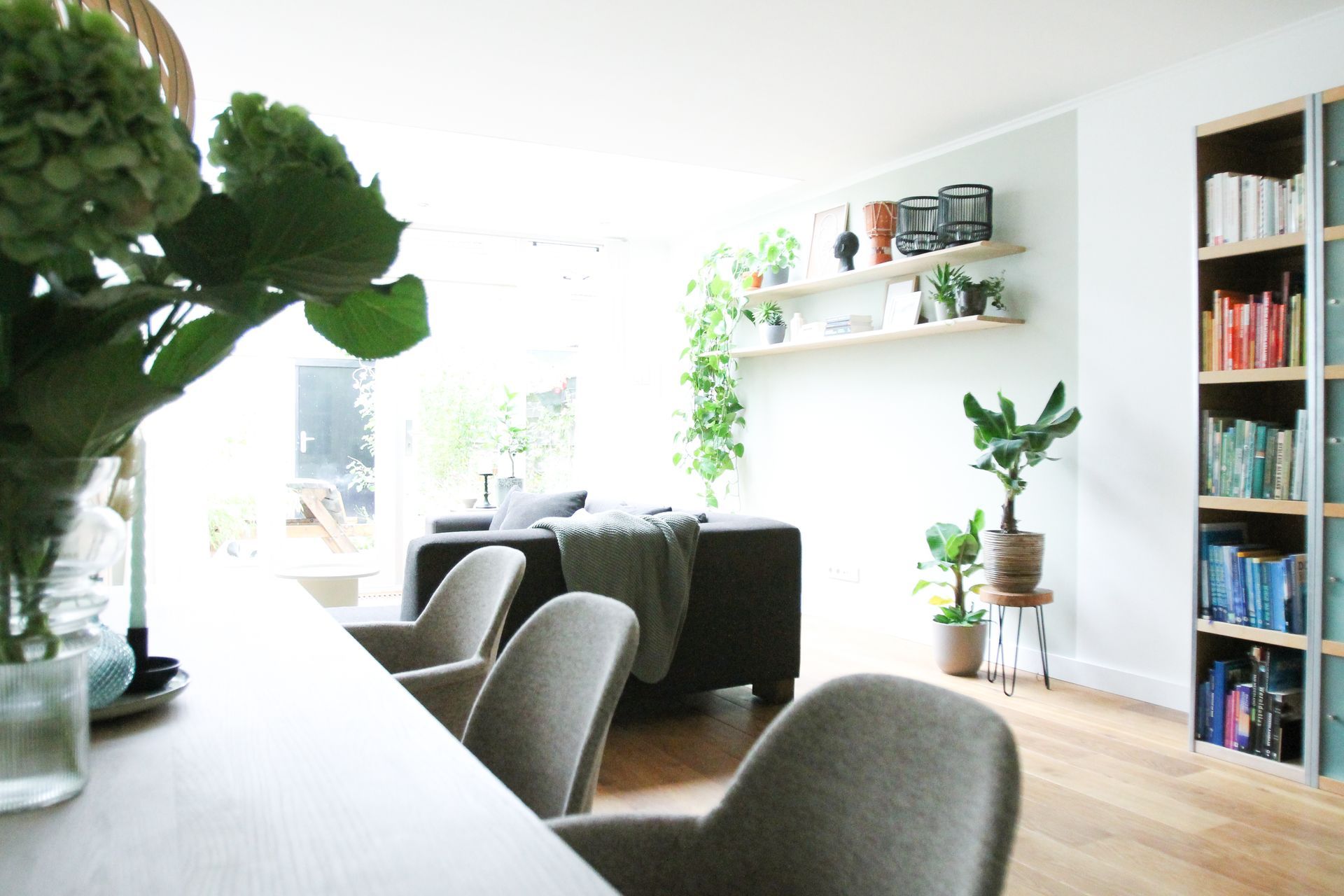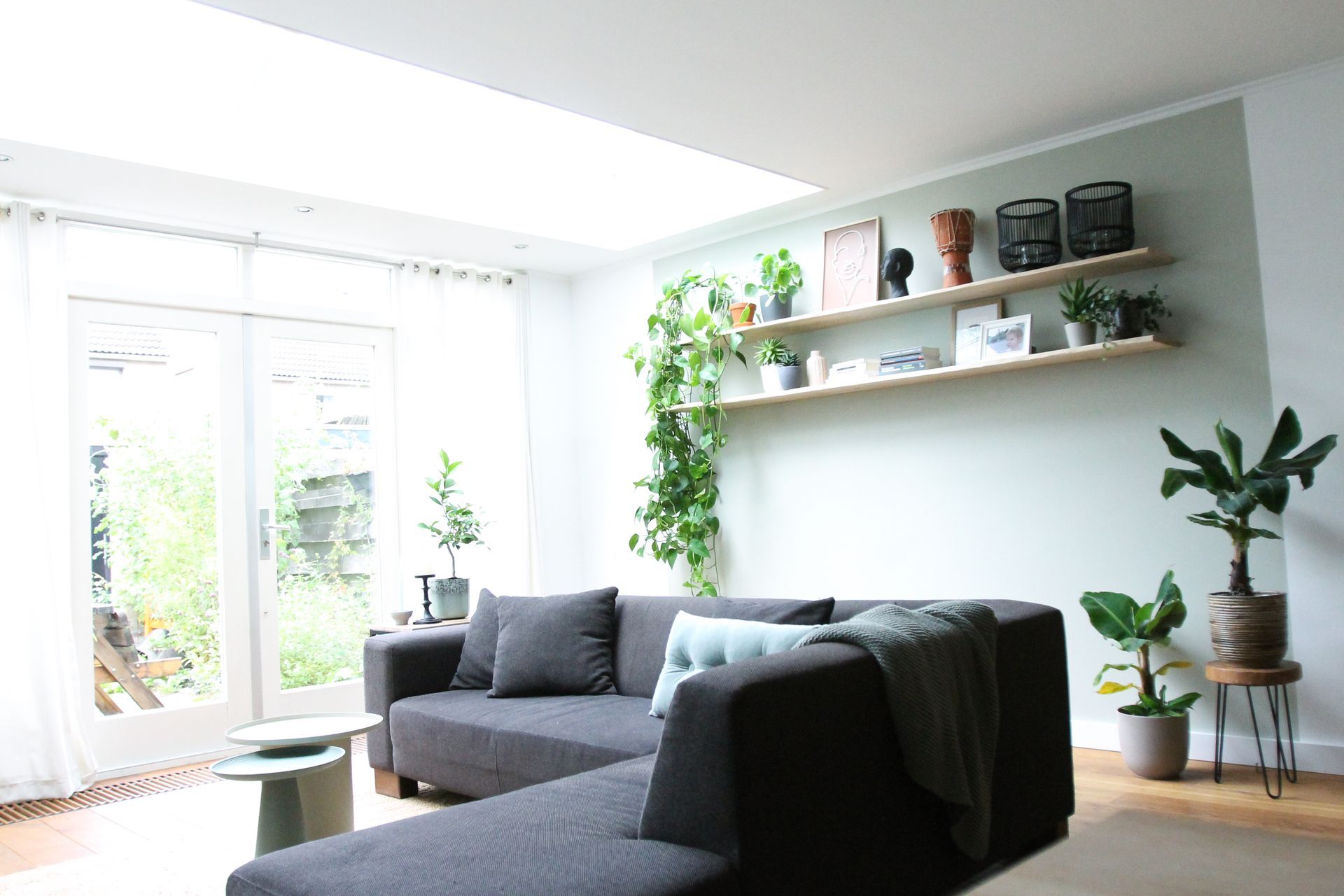 Op de muur waar prachtig licht opvalt door de lichtstraat de kleur Mizzle van Farrow & Ball. Met 2 op maat gemaakte eiken houten planken waar alle planten heerlijk licht kunnen vangen om te groeien en bloeien.