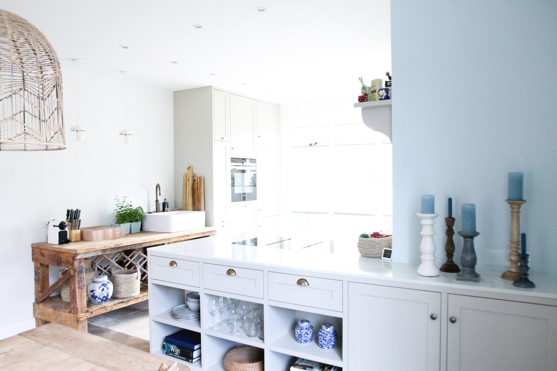 De keuken kreeg een nieuwe plek aan de voorzijde van het huis. Voor de nieuwe keuken maakte ik een ontwerp van een op maat gemaakte keuken met kookeiland. De uitdaging was dat er een vintage piece geintegreerd moest worden.