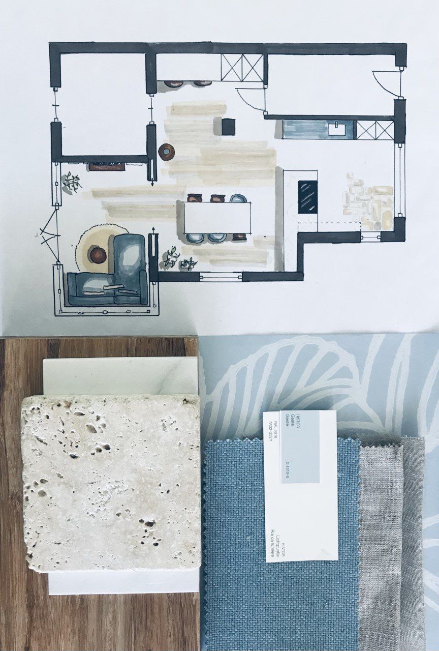 voor het gehele interieur ontwerp. Italiaans vakantiehuis met eigentijdse twist. Achteraf hebben we nog een donkerblauw samen toegevoegd aan het kleuren pallet, omdat er geen geschikte lichtblauwe stof was voor de bank die we wilden. Bij de afstyling heb ik nog een compositie gemaakt voor de gallery wall om de televisie heen.
